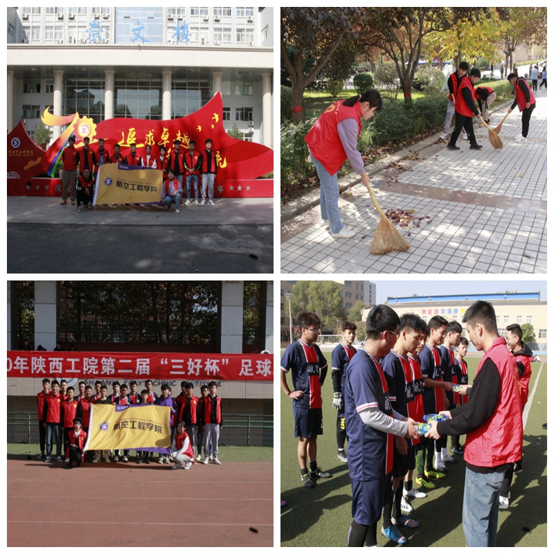 七十年春华秋实,七十年桃李芬芳,在我院七十周年校庆即将到来之际,为进一步激发学生热爱祖国、热爱校园、热爱生活的丰富情感,2020年11月7日上午,航空工程学院志愿者服务队以实际行动向学校70周年校庆献礼。十二名志愿者在校园认真打扫落叶,并为足球联赛的队员送水,为他们呐喊助威,以热情饱满的精神面貌迎接我校70周年庆典。