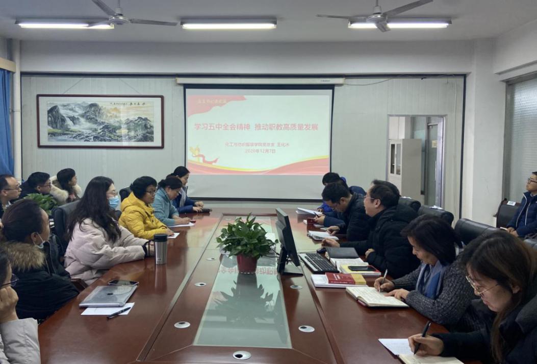 化纺服学院党总支书记王化冰从十九届第五次会议中央委员会召开的方式、会期与参会人员、主要议程、五年规划的重要性、规划涉及的方面、五中全会《建议》编制的进程、建议的内容、二〇三五年基本实现社会主义现代化远景目标、“十四五”时期经济社会发展主要目标、实现奋斗目标的举措,充分发挥坚持党的全面领导,动员各方面力量为实现“十四五”规划和2035年远景目标而团结奋斗的强大作用等方面,对党的十九届五中全会进行了全面系统的讲解。王化冰书记最后强调:全体教师和党员要认真学习、深刻领会、全面把握全会精神,切实把思想统一到五中全会精神上来,学深悟透精神,提高政治站位,推动职业教育高质量发展。
