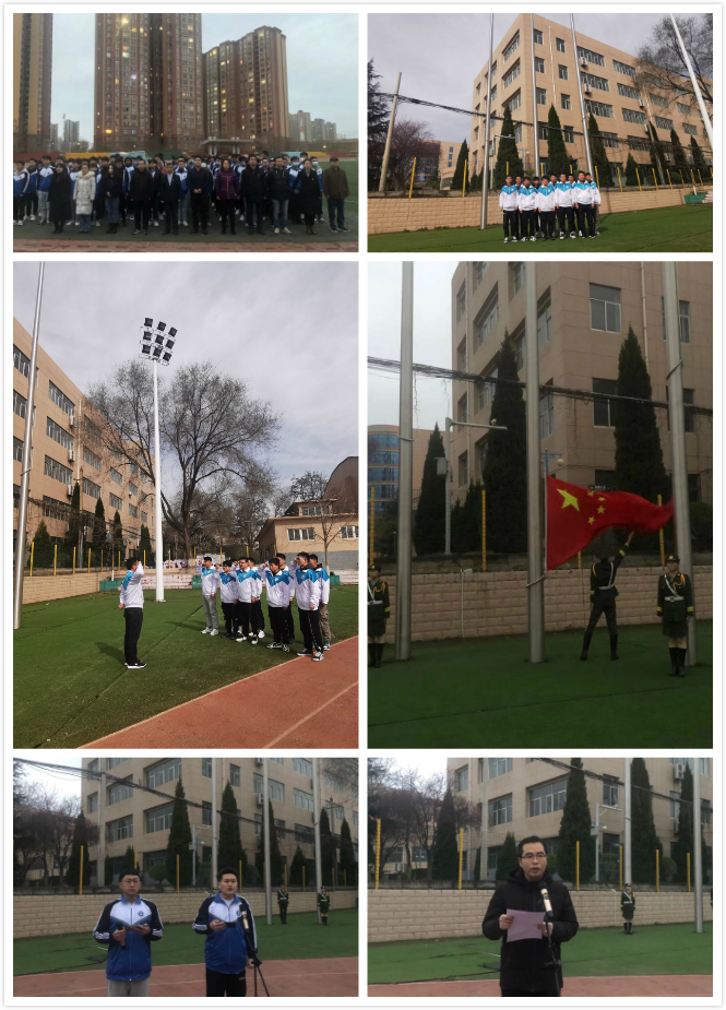 7点整,升旗仪式正式开始。英姿飒爽的国旗护卫队护送鲜艳的五星红旗入场,伴随着庄严的《义勇军进行曲》,五星红旗冉冉升起,全体师生肃立凝视,高唱国歌。