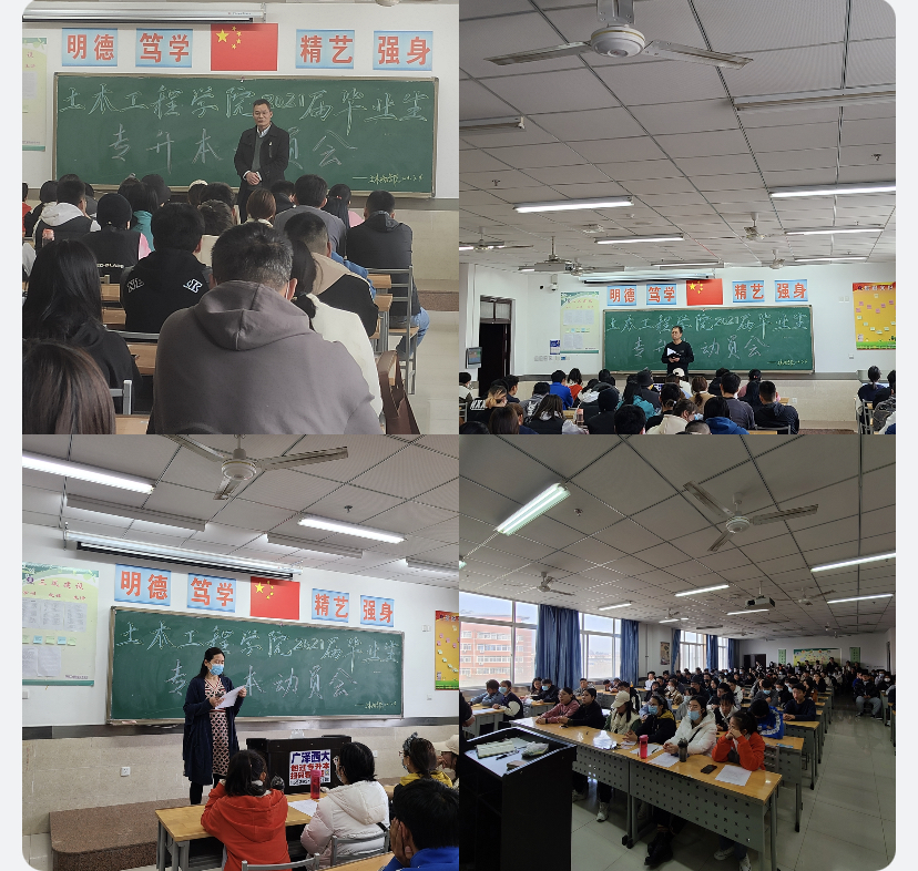 为促进我院专升本工作的不断突破,并激励备考学生以积极饱满的精神状态参加考试。3月4日下午,土木工程学院在崇明楼4007召开了2021届毕业生专升本动员大会。党总支书记张科海,学工办主任马俊,辅导员宋群芳、曹健与200余名备考学生共同参与了此次会议。