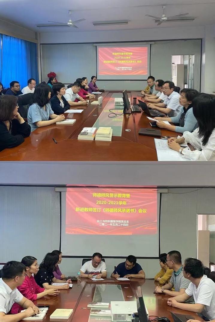 为进一步加强师德师风建设,5月24日下午,化工与纺织服装学院在崇文楼811会议室召开师德师风警示教育暨新进教师签订《师德师风承诺书》会议,会议由化纺服学院党总支书记贾格维主持,学院全体教职工参会。