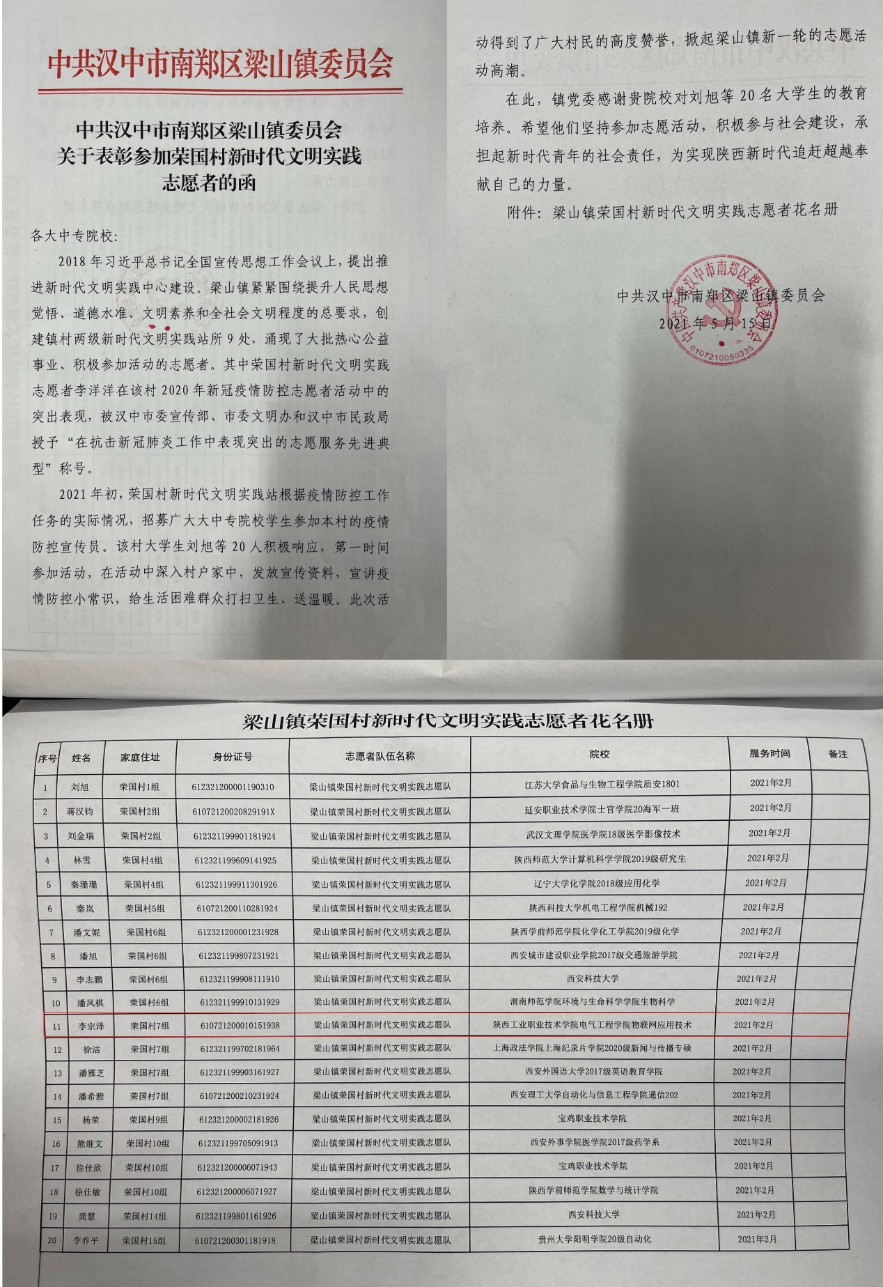 近日,电气学院收到中共汉中市南郑区梁山镇委员会发来的关于表彰参加荣国村新时代文明实践志愿者的函,表扬物联网应用技术2002班李宗泽同学积极主动加入文明实践志愿服务队伍,为当地疫情防控工作做出奉献,并对我院人才培养的努力给予了感谢。
