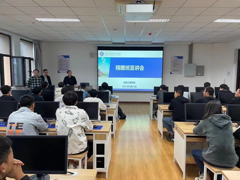 9月27日下午,北京精雕集团公司订单班宣讲会在精艺楼2005实训室举行。机械工程学院院长赵明威,党总支书记苏宏志、北京精雕集团“精雕班”项目负责人王帅,以及机械学院各专业110余名学生参加了本场宣讲会,会议由机械学院订单班负责人吴玉文老师主持。