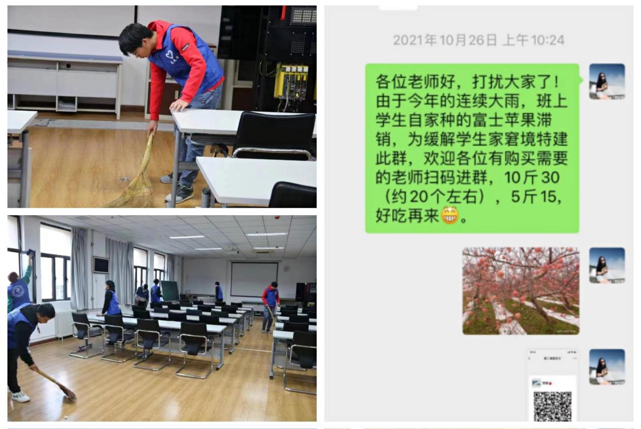聚焦学生需求,开展精准帮扶。飞机机电设备维修2001班的班主任南亨老师带领、督促学生养成良好的学习,生活习惯。他利用每天晚自习时间,逐次跟班里每一个学生都进行了沟通交流,了解了每一个学生的基础与学习程度,再根据不同学生的接受能力进行课程辅导。最终,经过南亨老师与学生们的共同努力,在高数、英语期末考试中,全班31名同学,无一人挂科,其中75%学生的高数成绩在80分以上,56%学生的英语成绩在80分以上,真正达到了因材施教,精准育人的目的。机电2007、2008班班主任马艺琰老师,在日常了解学生近况时得知一位学生今年因为天气原因导致家中的苹果滞销,作为家中唯一的收入来源,苹果的滞销无疑断了学生家中5口人的粮。马艺琰老师为了帮助学生困难问题,主动提出帮助销售滞销苹果。与学生沟通后,决定通过新媒体销售方式进行销售,因为苹果的品质很不错,价格又低廉,订单接踵而来,在航空工程学院领导的支持和鼓励下,在学院老师的帮助下,他们第一次就销售出280斤苹果。马艺琰老师用行动关心学生,并且帮助学生解决困难,这些都离不开陕西工院以及航空工程学院领导们的支持和引领,在党的关怀和领导下,学生可以申请助学补贴,又通过自己努力帮助家庭解决困难。