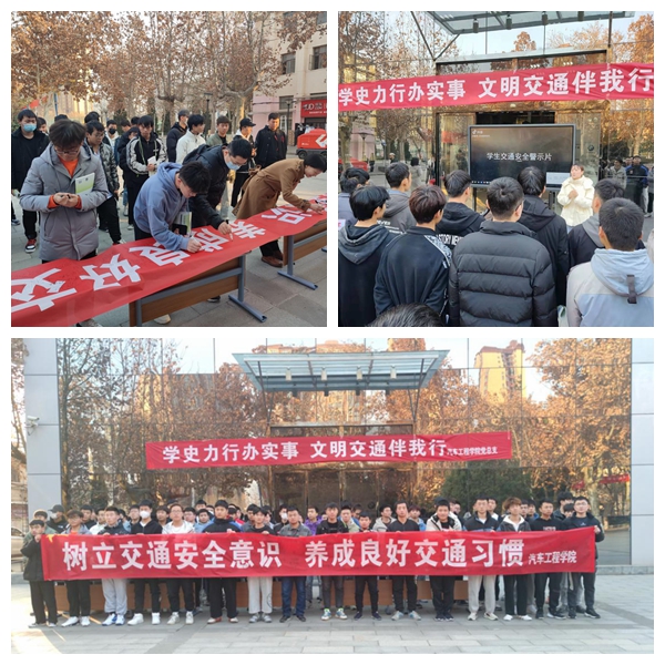 活动以“学史力行办实事,文明交通伴我行”为主题,通过悬挂主题标语横幅,营造活动氛围。围绕活动主题,面向全校师生开展“树立交通安全意识,养成良好交通习惯”承诺签字仪式。最后,汽车工程学院教师支部统战委员鲁玺开展了“文明交通”知识讲座,通过视频、宣传展报的形式将文明交通、遵守交通规则知识进行宣传展示,让交通文明意识更加深入人心。