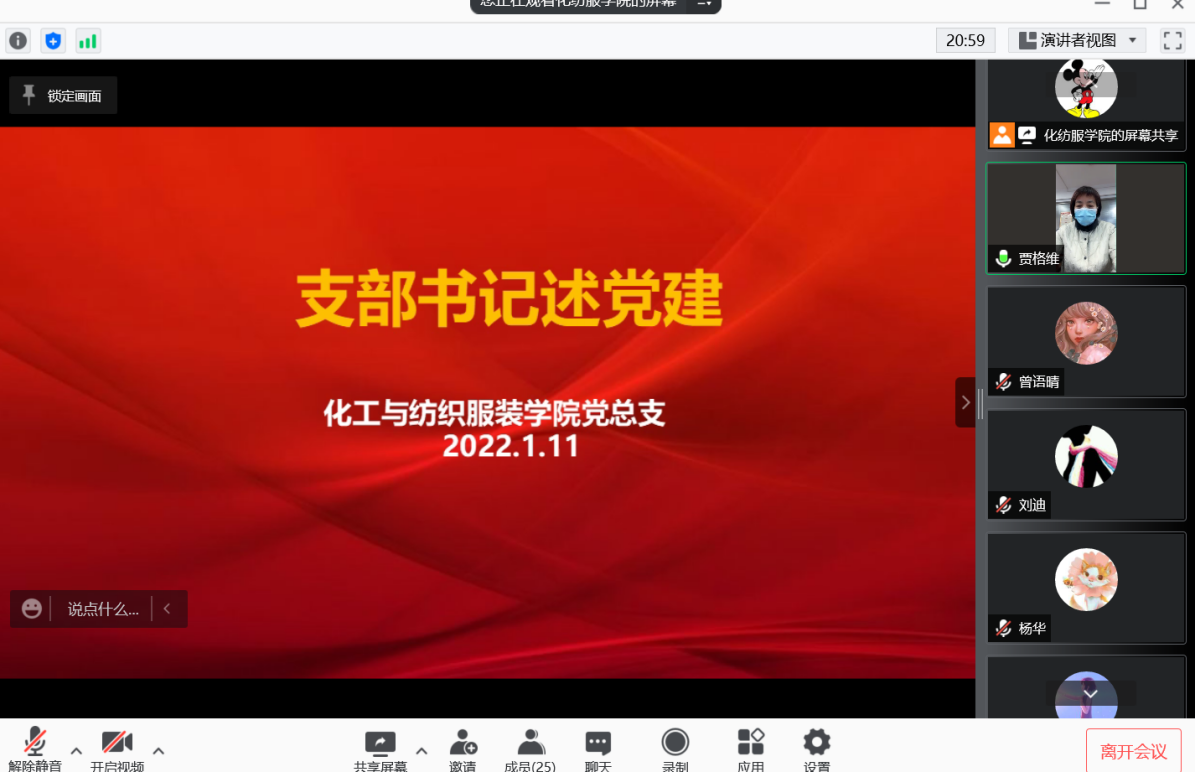 1月11日,化纺服学院支部书记述党建评议会通过线上方式顺利召开,我院党总支书记贾格维、院长王化冰等五人在崇文楼811集体参加线上会议,其余党员老师线上参会。