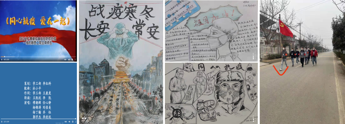 强化疫情防控宣传,做好舆论引导。始终把疫情防控作为重点任务,把师生生命安全摆在首要位置,高度重视舆论引导和宣传教育工作。学院杜小平老师,在确保学生公寓值班工作圆满完成的同时,积极主动地投入到学校疫情防控宣传中,发挥自身特长,承担《同心抗疫爱在一起》宣传片配曲工作。各专业学生弘扬抗疫精神,采用手绘抗疫情主题海报的方式,掀起“执笔同心绘、抗疫情在行动”设计浪潮,为一线的防疫英雄加油鼓劲。学院18级毕业生王佳凯等同志积极参与地方一线防控工作,为疫情防控献青春力量,向社会各界展示了陕西工院人的责任与担当。
