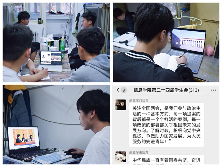 为进一步充实同学们的封校生活,引导广大青年学生关注两会,理解党和国家的重要政策,学习“两会”的精神,更好地在疫情防控中培育青年学生的责任担当。近期,信息学院组织全体学生干部、青年团员开展了“青年观两会”专题学习活动。