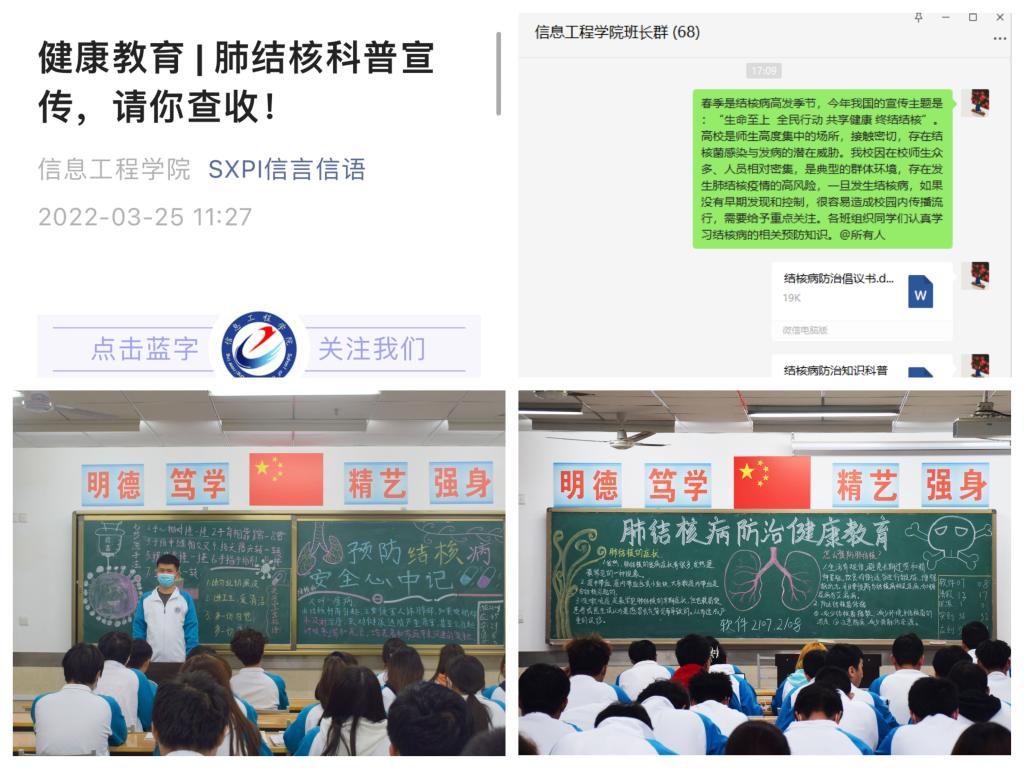 为进一步宣传普及结核病防治知识,提高在校学生的自我保护意识,做好校园结核病防控工作,保障学生身体健康。根据学校《关于做好2022年结核病健康教育活动》的通知,4月1日晚,信息学院在各班晚自习教室召开预防结核病主题班会。
