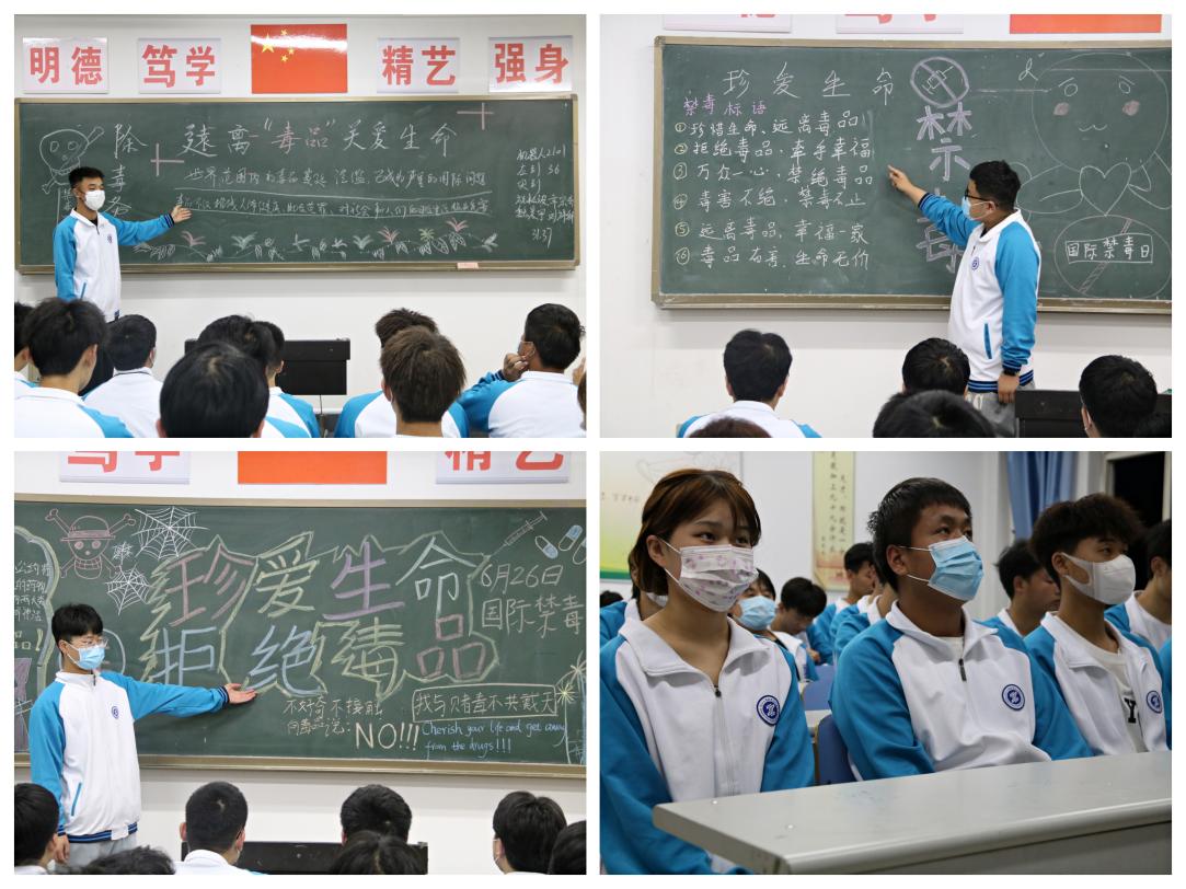 班会上,各班班长为同学们宣讲毒品预防知识并播放《珍爱生命,远离毒品》视频片,使同学们进一步了解到毒品的危害及现阶段我国青少年禁毒教育的严峻形势。同学们通过讨论发言、自编自演禁毒小品相声等形式,表达自己的认识与感受,并表示要拥有一双慧眼,坚定一个信念,高举禁毒旗帜,创造幸福生活。