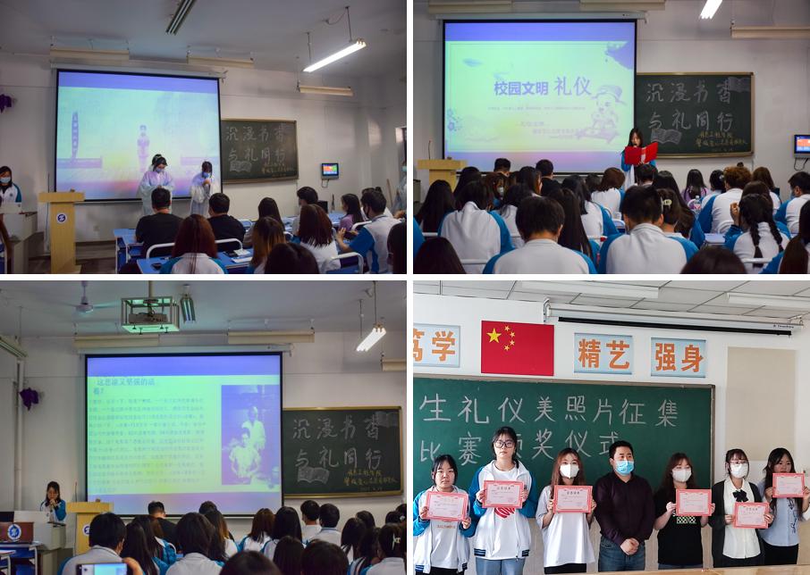 学--以学生为主体,班主任为主导,讲授礼仪之道。信息学院组织大一所有班主任,连续5周利用晚自习时间开展礼仪美主题班会,具体包含:规范仪容仪表、体悟言行文明、学会校园礼仪美、体验职场礼仪美、提升社交礼仪美五个方面,通过提升学生形象美、语言美、行动美、心灵美的素质,从而提升学校校园的文明水平。