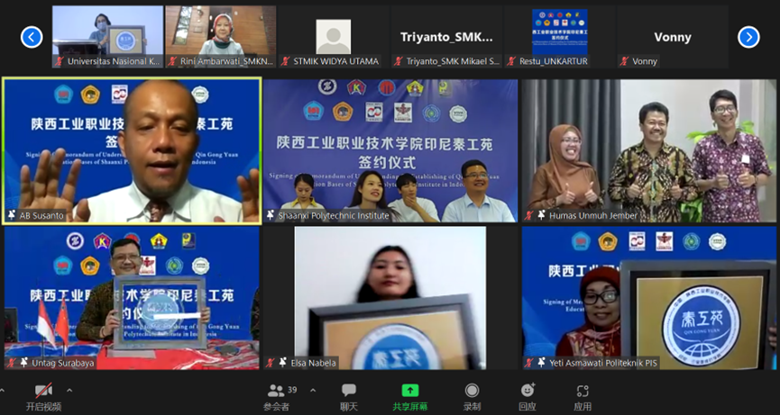 7月7日下午,我校印尼分校秦工苑筹建预备会以视频会议形式举行。印尼东爪哇省教育厅职教项目负责人Diah Sawitri博士出席会议并致辞,中国教育国际交流协会副秘书长余有根视频致辞,印尼10所秦工苑共建院校负责人出席。