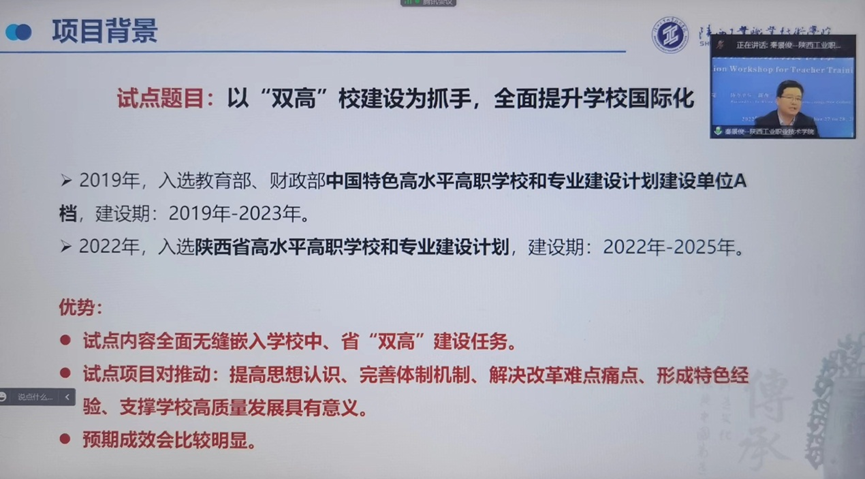 评估会上,国际教育学院院长秦景俊代表学校,从项目实施背景、主要任务、初步成效等方面介绍了我校“以‘双高’校建设为抓手,全面提升学校国际化”试点项目的基本情况,并从“责任落实情况”“工作进展情况”“资源保障情况”“宣传知晓情况”等方面,向专家组逐一展示了相关佐证材料。