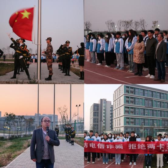 升旗仪式结束后,电商2304班张宇鹏同学在国旗下发言。他号召大家注意保护个人信息,不轻信陌生人的口头许诺,多留心多防范,以免成为电诈分子的针对目标。