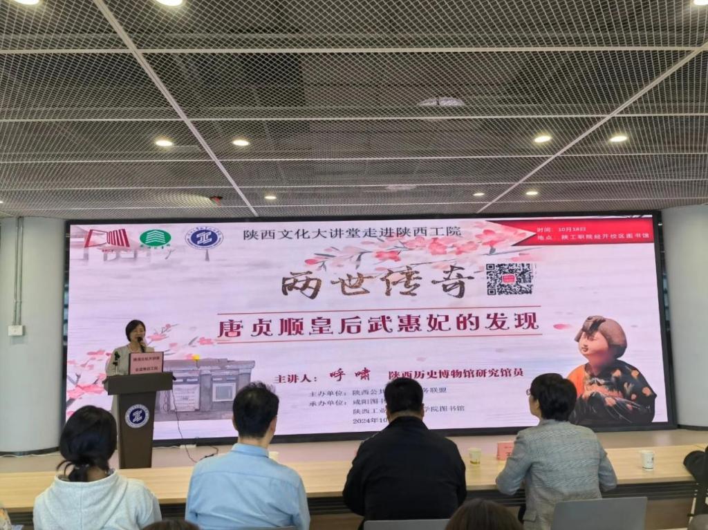 10月18日下午,由陕西公共图书馆服务联盟主办、咸阳图书馆和我校共同承办的“陕西文化大讲堂走进陕西工院”活动在我校经开校区“工院记忆研习空间”举行。本次讲座主题为《两世传奇——唐贞顺皇后武惠妃的发现》,主讲嘉宾为陕西历史博物馆研究馆员呼啸老师。咸阳图书馆馆长杨岳,我校图书馆馆长王丁,副馆长王艳,以及200余名师生在现场参与了本次活动,此外本次活动还通过图书馆“工图书香”微信公众号和咸阳图书馆公众号进行了直播。