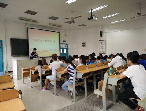 5月18日下午,汽车工程学院在崇文西楼201教室举办了“诚信大学生”演讲比赛,学生会干部和班干部10余人担任评委,学工办主任刘冽、全体辅导员以及200多名学生观看了比赛。