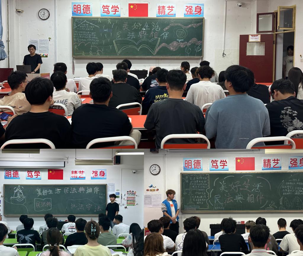 班会伊始,各班主持人率先登场,深入阐释民法典颁布的重大意义,点明它是维护公民权利、保障社会公平正义的关键法律支撑。随后,借助精心挑选的普法视频和制作精良的PPT,将民法典中与日常生活紧密相连的条款,如物权、合同、人格权、婚姻家庭、继承等内容,以直观易懂的方式呈现给同学们。互动环节将班会气氛推向高潮,同学们踊跃发言,提出生活中遭遇的法律困惑。有的同学好奇在网络购物时商品出现质量问题该如何维权,有的同学则关注校园借贷可能潜藏的法律风险。法律知识储备丰富的同学挺身而出,依据民法典的具体条文,给出专业且实用的解答,现场讨论热烈非凡。