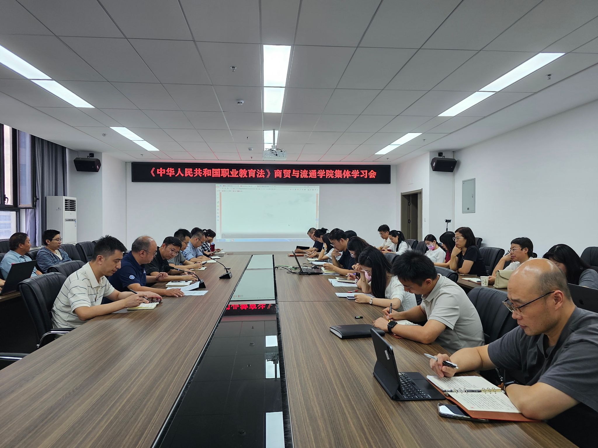 会议伊始,张光同志围绕新的《职教法》全文展开系统领学。他逐章逐节解读法律条文,重点梳理了《职教法》在职业教育定位、育人目标、保障机制等方面的新变化与新要求,尤其强调了法律中“职业教育与普通教育具有同等重要地位”“推动职业教育高质量发展”等关键内容。在领学过程中,他结合商贸学院人才培养实际,提出明确学习要求:“各教研室需以本次集体学习为起点,结合电子商务、市场营销、现代物流管理等专业特色,制定专项学习计划,开展细致研讨,确保每位教职工都能吃透法律内涵,将法律要求转化为推进专业建设、优化教学实践的具体举措。”