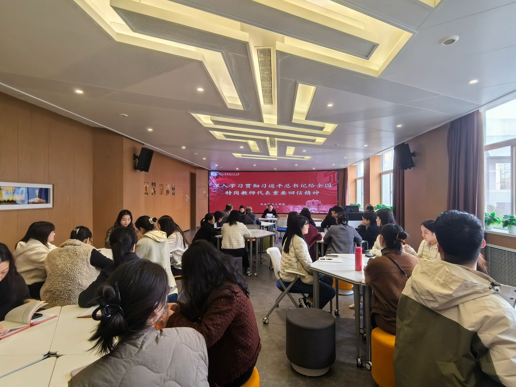 为进一步增强思政课教师的责任感和使命感,推动思政课建设高质量发展,11月4日下午,马克思主义学院组织全体教师在VR实训中心开展深入学习贯彻习近平总书记给全国特岗教师代表重要回信精神研讨会。