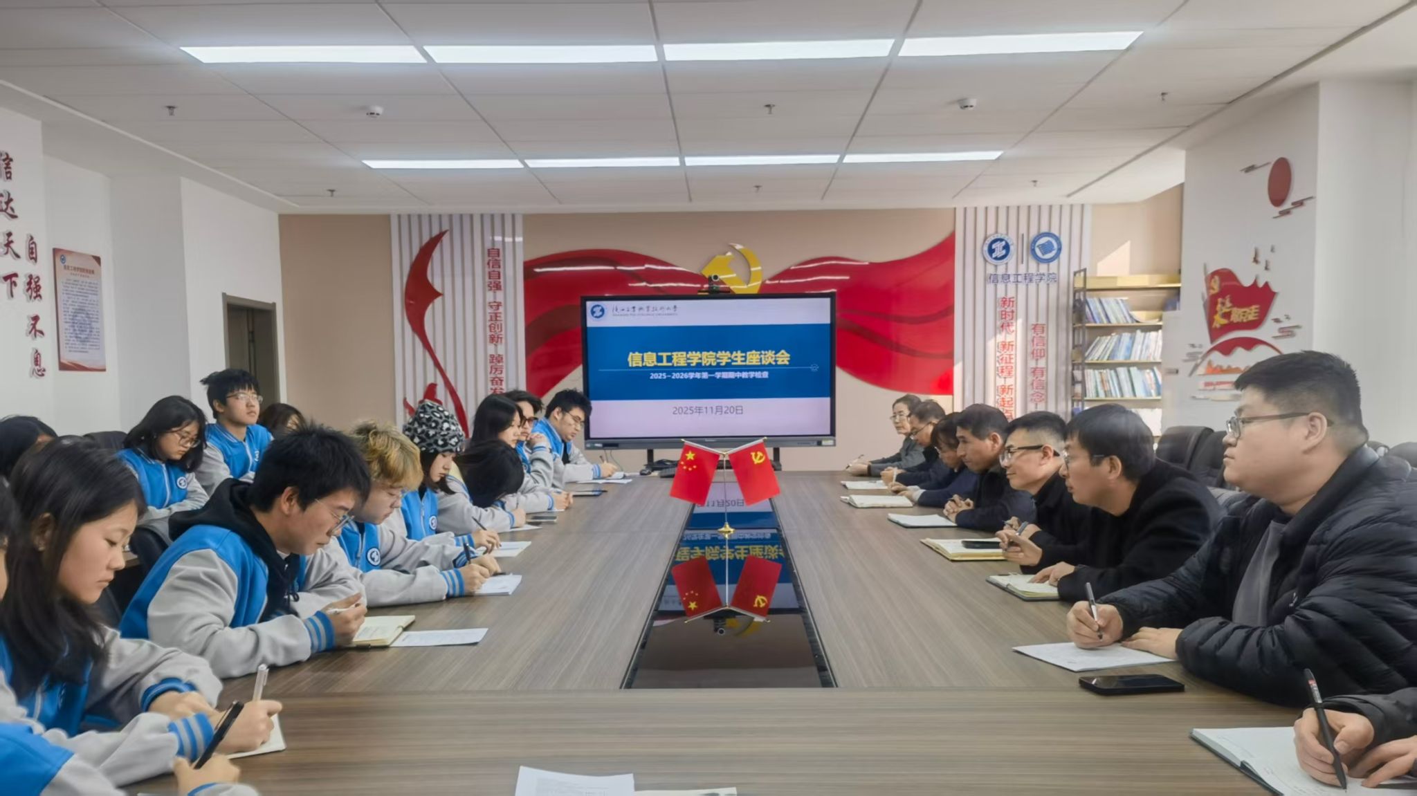 为落实学校期中教学检查工作安排,进一步提高学院教育教学质量,11月20日下午,信息学院于崇理楼C801召开2025-2026学年第一学期期中教学学生座谈会。信息学院党总支书记王伟、院长白国政、党总支副书记郭新玲、教学办主任宋承继、工程技术训练中心主任吕阿璐、辅导员代表与学生代表参加了会议,会议由学工办主任赵松主持。