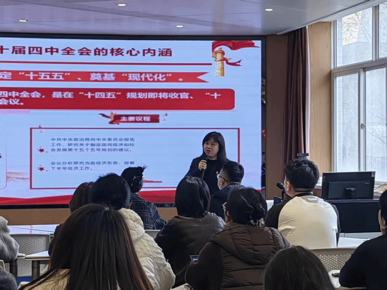 为持续深入推进党的二十届四中全会精神学习宣讲,12月15日,我校学习宣传贯彻党的二十届四中全会精神宣讲团成员、马克思主义学院院长舒蕾为学院教师作题为《深学笃行二十届四中全会精神 勇担“十五五”现代化新使命》的专题宣讲,引导大家深刻领会全会精神,凝聚奋进力量。
