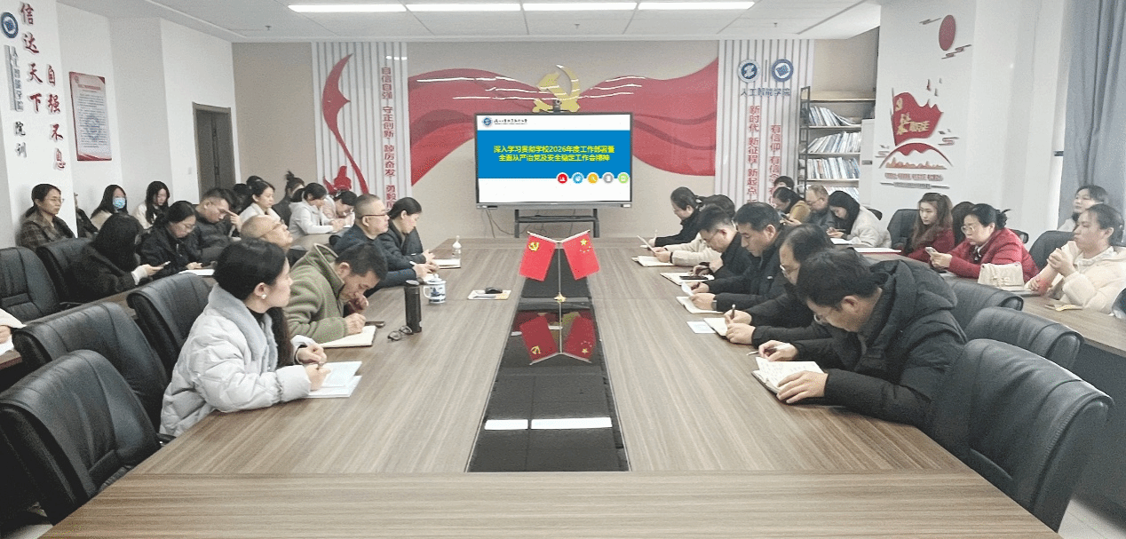 随后学习传达校长刘永亮所作的《学校2025年工作总结并部署安排2026年重点工作》,回顾学校围绕“办学能力高水平、产教融合高质量”建设取得的“十大新突破”,并深入解读学校“高质量党建引领、高起点谋划发展、高标准培养人才、高规格育人成才、高水平产教融合、高效能治理保障”的重要内涵。他强调,学院发展要紧扣国家战略、产业升级和技术迭代需求,精准对接区域产业发展实际,切实将学校工作要求转化为学院发展具体行动。同时,他结合近期教学工作实际,对人才培养方案论证、单招工作推进、本科课程标准撰写等重点任务作出具体部署。