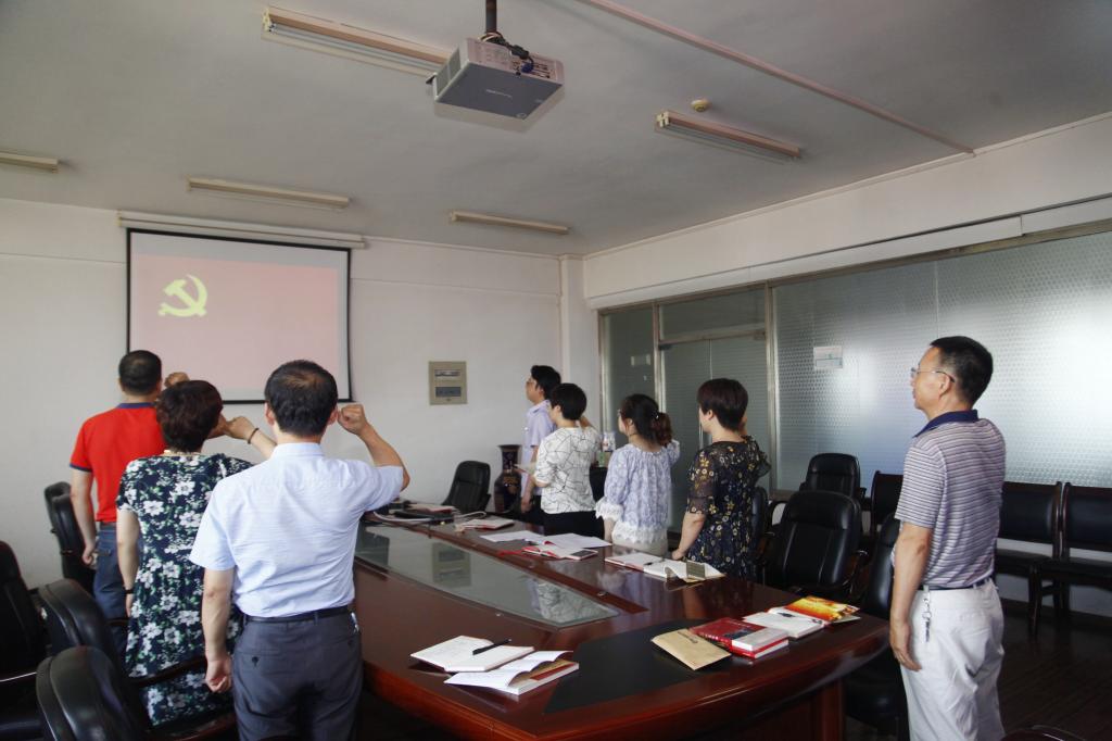 主题党日活动现场,支部全体党员重温入党誓词,并集体观看了教育片《追寻习近平同志的初心》。