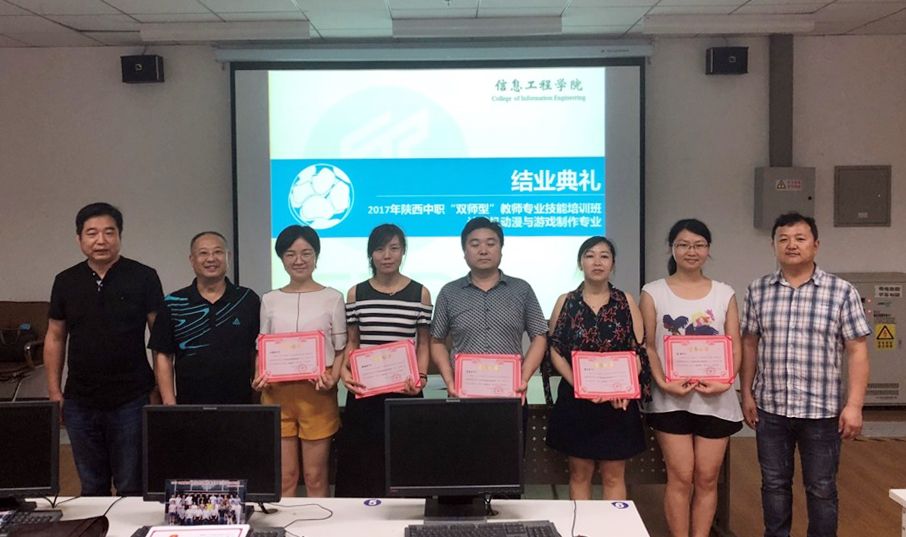 7月20日下午,由信息工程学院承办的陕西中职“双师型”教师计算机动漫与游戏制作专业培训班结业典礼在精艺楼举行,信息学院副院长殷锋社、信管教研室主任王坤、软件技术教研室主任赵革委、培训班班主任朱梦楠及25名学员参加典礼。