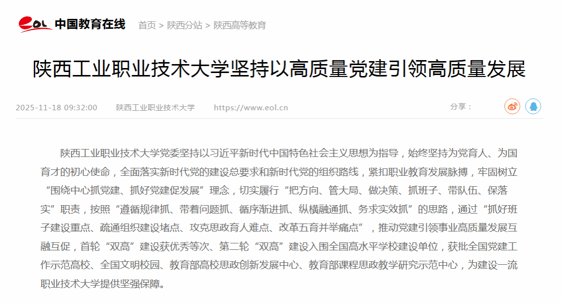 陕西工业职业技术大学党委坚持以习近平新时代中国特色社会主义思想为指导,始终坚持为党育人、为国育才的初心使命,全面落实新时代党的建设总要求和新时代党的组织路线,紧扣职业教育发展脉搏,牢固树立“围绕中心抓党建、抓好党建促发展”理念,切实履行“把方向、管大局、做决策、抓班子、带队伍、保落实”职责,按照“遵循规律抓、带着问题抓、循序渐进抓、纵横融通抓、务求实效抓”的思路,通过“抓好班子建设重点、疏通组织建设堵点、攻克思政育人难点、改革五育并举痛点”,推动党建引领事业高质量发展互融互促,首轮“双高”建设获优秀等次、第二轮“双高”建设入围全国高水平学校建设单位,获批全国党建工作示范高校、全国文明校园、教育部高校思政创新发展中心、教育部课程思政教学研究示范中心,为建设一流职业技术大学提供坚强保障。
