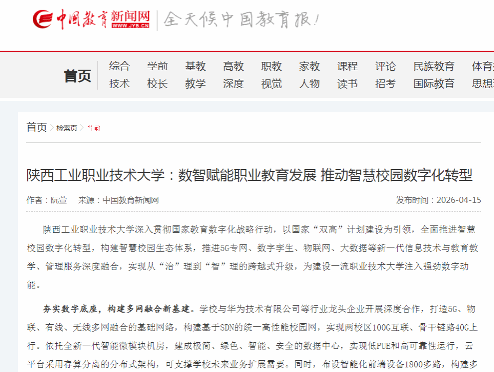 陕西工业职业技术大学深入贯彻国家教育数字化战略行动,以国家“双高”计划建设为引领,全面推进智慧校园数字化转型,构建智慧校园生态体系,推进5G专网、数字孪生、物联网、大数据等新一代信息技术与教育教学、管理服务深度融合,实现从“治”理到“智”理的跨越式升级,为建设一流职业技术大学注入强劲数字动能。