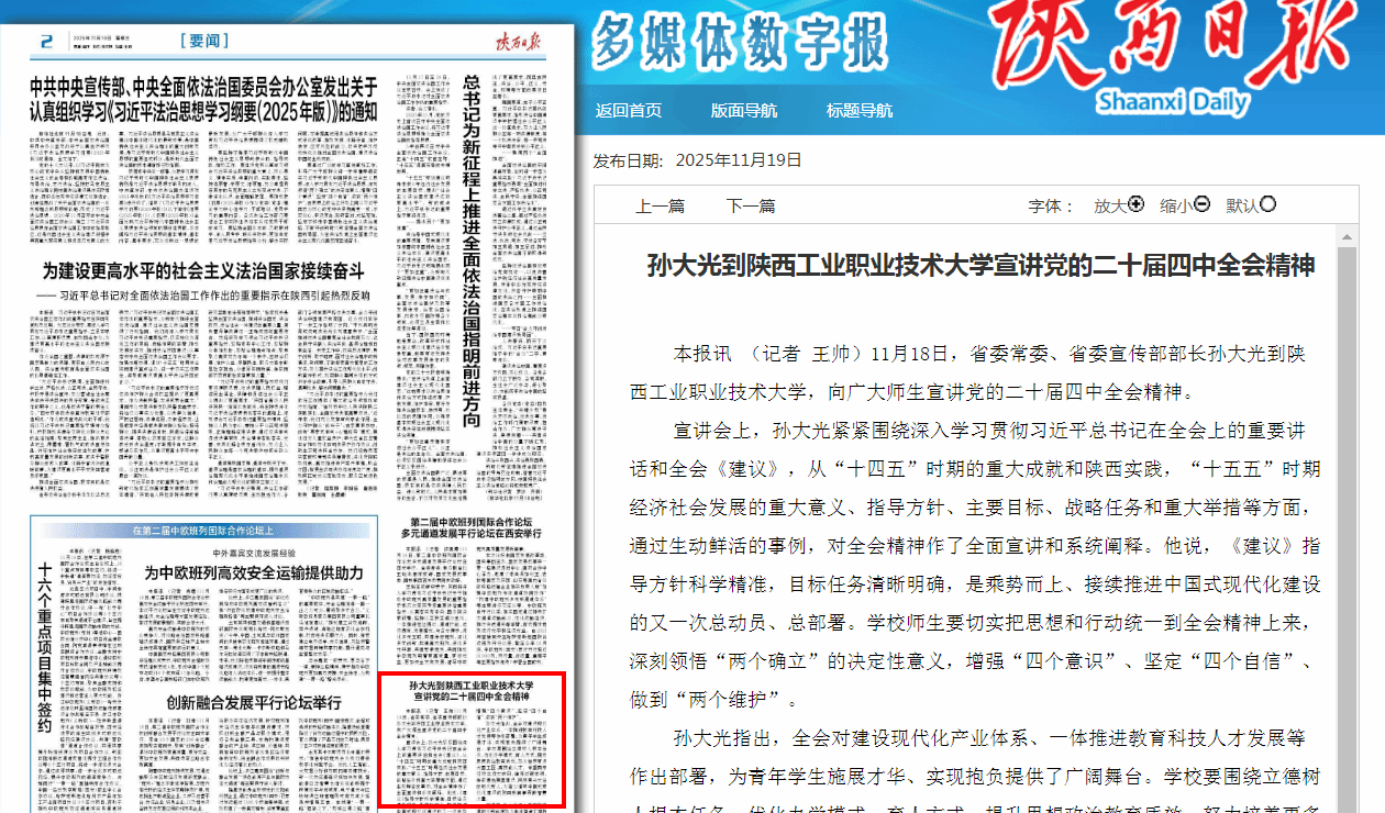 本报讯 (记者 王帅)11月18日,省委常委、省委宣传部部长孙大光到陕西工业职业技术大学,向广大师生宣讲党的二十届四中全会精神。