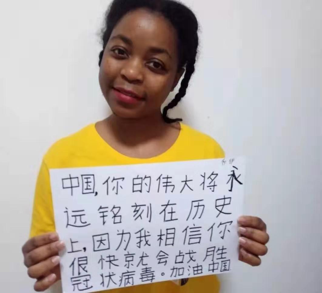 留学生乔伊在纸上写下了对为中国加油的话语,祝愿中国早日打赢防控疫情的阻击战。