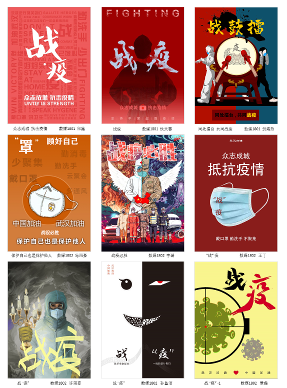按照“停课不停学”的要求,信息学院刘霞老师教授的数媒1801班、02班《平面广告设计》课程在在线课程资源的支撑下如期开课。为了保证疫情防控期间的教学进度和教学质量,她做到“线下精心组织,线上认真教学”。在通过学堂在线课程视频资源和雨课堂语音直播方式组织指导教学之后,以当前疫情防控为鲜活素材,用战“疫”核心主题词思维导图的训练形式,布置了以“2020全国大学生广告设计大赛命题——战‘疫’”为主题的公益广告设计实践教学任务,要求学生在疫情共克时艰的关键时刻,将所见所闻所悟通过自己独特的构思设计制作完成。教学任务得到了同学们的积极响应,同学们设计出一幅幅描绘携手共同战“疫”决心、信心和勇气的作品,表达了心中美好的祝福和对消灭疫情后美好生活的期盼。