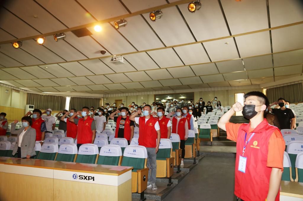 在自动化1804班武旭东同学代表全体志愿者作表态发言后,与会的100余名志愿者还进行集体宣誓。他们将紧紧围绕学院疫情防控的大局,团结协作,敬业奉献,服从指挥,发扬“奉献、友爱、互助、进步”的志愿者精神,以最强合力做好校园疫情防控志愿服务工作。
