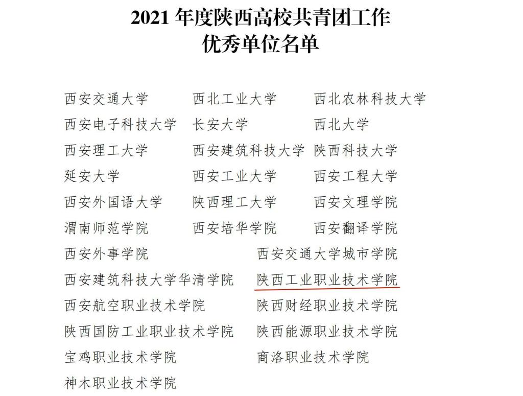 2021年,学校共青团在校党委和上级团组织的坚强领导下,坚持以习近平新时代中国特色社会主义思想为指导,紧密围绕学校党政工作要点和上级团组织工作部署,聚焦庆祝建党100周年主线,聚焦主责主业,在强化思想引领、提升组织活力,服务学生成长,推进团学改革取得了显著成效。校团委顺利通过陕西省首批高校团建示范创建验收,视频号荣获全国高职院校“综合影响力百强”,荣获社会实践“全国大学生‘千校千项’网络展示活动优秀团队”“陕西省优秀组织单位”,荣获“挑战杯”国赛红色专项赛一等奖等省级以上集体、个人荣誉20余项,1个社团入选全国高校“百强学生社团”。