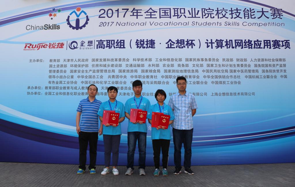 5月8日,2017年全国职业院校技能大赛高职组“锐捷·企想”杯计算机网络应用赛项比赛在天津圆满结束,来自全国30个省市的60支代表队180名选手参加了比赛。经过4个小时的比拼,信息工程学院教师李爱国、李文宇指导的网络1501班章浩、网络1602班宋阳和信管1502班王晨3名同学荣获团体二等奖。