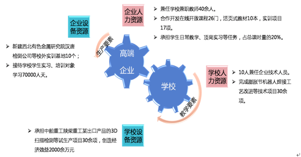 针对关键核心难题,联合共享资源盘活教学及生产要素。面对校企合作中存在的资产、人员共享问题,依托机械行业材料成型与控制技术职教集团,联合共享教学生产要素资源,通过校企互聘兼职教师、兼职企业技术人员,实现学校教师参与企业产品研发和工艺改进,企业员工参与学校人才培养;通过学校实训基地承担企业产品试制、真实载体的实训教学和企业车间承担院校的现场认识实训和远程生产现场教学等工作,盘活学校和企业的教学及生产要素。