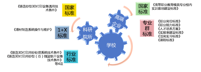 聚焦国家战略需求,联合产业高端企业共同研发标准。在中国铸造协会指导下,依托机械行业材料成型与控制技术职业教育集团,联合北京机科国创轻量化科学研究院、西安增材制造研究院等产业高端企业,发挥校企双方在增材制造等领域的新技术研发和人才培养优势,开发《铸造砂型3D打印设备通用技术条件》等国家标准、职业技能等级标准、行业标准6项,国家实训基地建设标准1项,更新专业群《实验室建设标准》等全套标准,通过标准建设和更新,填补了相关领域标准空白,及时将增材制造、精益生产等“三新”纳入教学内容,为材料成型专业群建设提供指导,见图2。