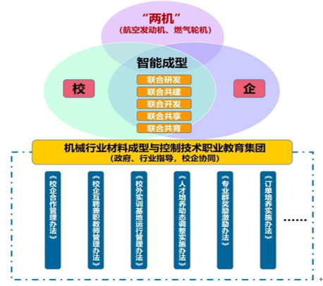 针对装备制造业转型升级带来的人才培养和产业需求在结构、质量、水平上还不能完全适应的问题,为促进教育链、人才链与产业链、创新链有机衔接,材料成型与控制技术专业群坚持职业教育校企合作、工学结合的办学特色,紧扣制造业经济命脉和“中国制造2025”发展战略,立足西部,面向航空航天、船舶等高端产业和产业高端转型升级,聚焦“两机”(航空发动机、燃气轮机)关键零部件智能成型,精准对接西部先进制造业高技术发展和区域中小微企业技术创新的人才需求,通过校企联合研发、联合共建、联合开发、联合共享、联合共育(简称五联合),精准服务西部装备制造振兴战略。
