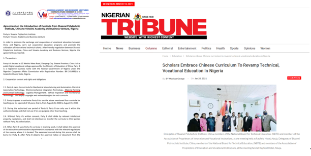 输出专业标准,为打造职业教育中国名片添砖加瓦。在全国机械行业教育发展中心、全国有色金属职业教育教学工作指导委员会、中国铸造协会等行业学会协会指导下,在国家智能铸造产业创新中心领军人才杨军高工、中船重工陕柴重工总工程师郭敏教授级高工等20余名行业专家积极参与下,经过多次论证,开发了反映智能成型产业发展方向和人力资源需求的材料成型与控制技术专业教学标准和26门相关课程标准,并被尼日利亚引进作为该国材料成型与控制技术专业教学标准,见图5。