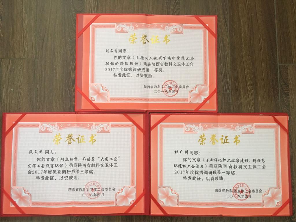 5月23日,陕西省教科文卫体工会在全省教科文卫体系统工会女工干部培训班上通报表彰了2017年度优秀调研成果和优秀调研单位(陕科文卫体工字[2018]17号)。我院2017年工运理论研究硕果累累:工会主席、统战部长刘文青获优秀调研成果一等奖,教师段文杰和祁广科获优秀理论研究成果三等奖。刘文青同志出席培训开班仪式并代表学院上台领奖。至此,我院工运理论研究工作已经连续七年获得省教科文卫体工会通报表彰。