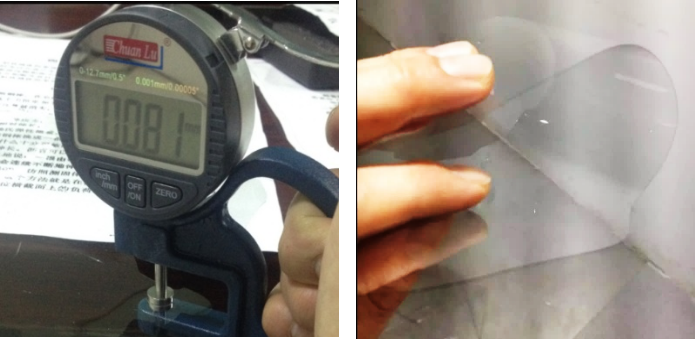2019年,团队成员以专利转让、技术支持等方式组建了国内第一个柔性玻璃热拉工厂,开发出国内自主知识产权柔性玻璃料方AMZ-6,及最为关键的核心成形设备:铂铑合金板根成型器、梯度温控炉、多层变速夹持装置等装备,打破核心设备技术垄断。成功拉制出120μm、100μm(图2)、80μm、50μm多档次厚度的柔性玻璃,实现最长300mm切割,最小弯曲半径3.5mm(图3)。该成果获得国内多位专家认可,并在央视二套、教育频道、中国教育报等多家媒体报道。