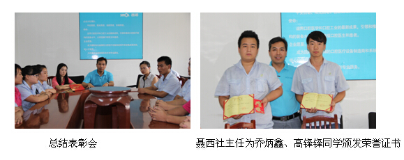 8月22日下午,实习总结会议在公司四楼会议室召开。公司领导聂西社主任对此次顶岗实习的学生在实习期间的工作和学习态度给予高度评价,对实习期间表现优异的机电1201班乔炳鑫、机电1204班高锋锋两位学生进行了表彰,颁发了荣誉证书,并为每位学生赠送了的小礼品,期望每位“西诺”班的学员在以后的学习工作中更上一层楼。
