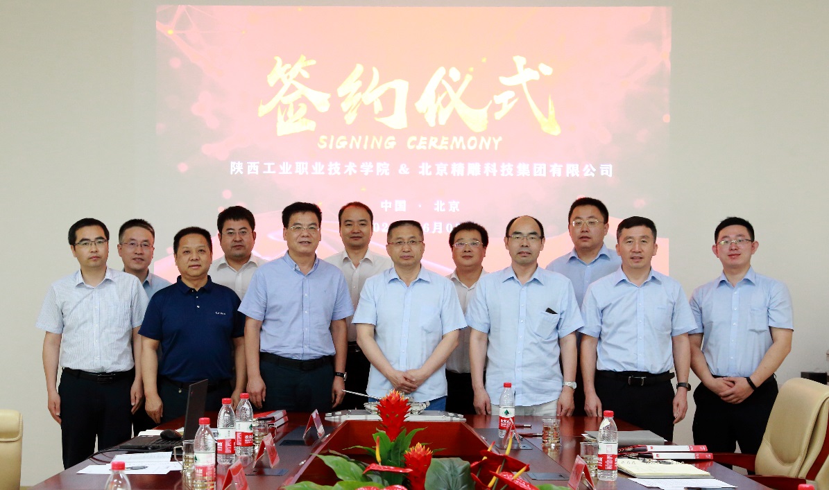 6月5日上午, 我院与北京精雕科技集团有限公司在北京精雕科技集团主楼5号会议室签订战略合作协议。精雕董事长兼总裁蔚飞、执行总裁张保全、运营总监兼职教合作中心总经理于洋、运营总监兼西安研发中心总经理蔡锐龙、西安精雕软件科技有限公司总经理助理王帅,我院院长刘永亮、双高办主任卢庆林、校企合作处处长卢文澈、产教融合研究院院长王建军、机械工程学院院长赵明威、机械工程学院党总支书记苏宏志等相关职能部门负责人参加签约仪式。会议由蔡锐龙主持。