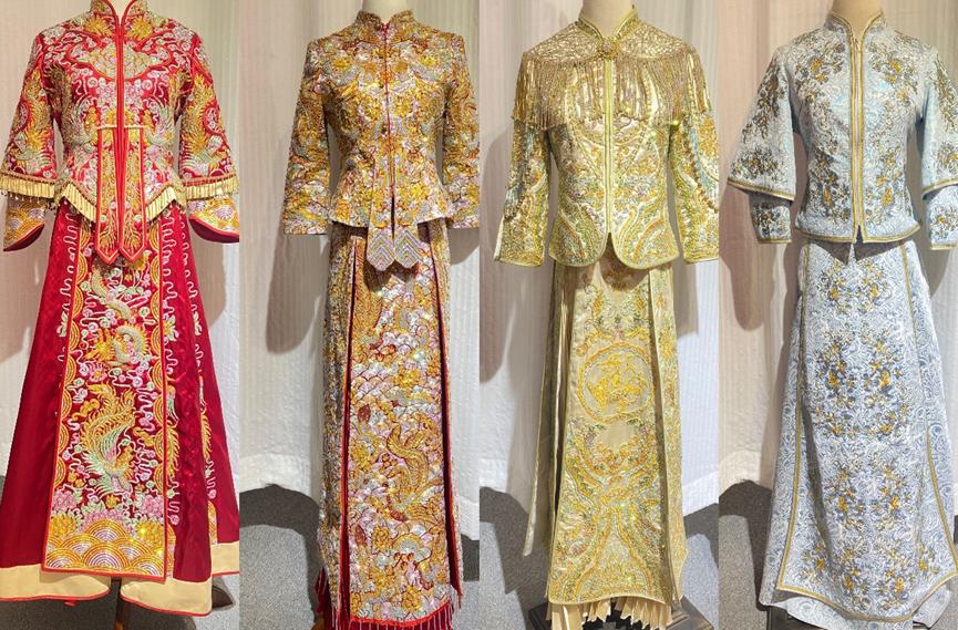 秀禾服的寓意。秀禾服的制作方法较为复杂,现今以潮汕手工最为著名。秀禾服的“褂”是指上身的对襟衣,“裙”则是下身长裙。随着时代改变,裙褂逐渐演变为“红褂红裙”。现在流行的改良款式为修腰、中袖、拉链设计,变得更时尚及舒适。秀禾服的长度刚到脚踝,与刺绣而成的绣花鞋搭配最为相衬。以前,以绣龙凤、鸳鸯、花草等吉祥图案为主,上个世纪五十年代,兴起珠片、珠石裙褂,图案以龙凤为主,取龙凤“呈祥”与“情长”的同音寓意。时至今日,裙褂上的图案以龙凤为主,以“福”字、“喜”字、牡丹花、鸳鸯、蝠鼠、石榴等寓意吉祥、百年好合的图案点缀。