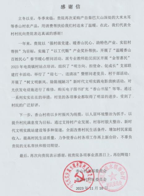 香山村“两委”发来感谢信