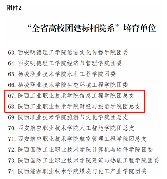 近日,共青团陕西省委、中共陕西省委教育工委公布了全省高校团建示范单位培育资格名单,我校信息工程学院团总支、财经与旅游学院团总支入选“全省高校团建标杆院系”培育单位;机械工程学院机械设计协会团支部、材料工程学院 i·未来协会团支部、航空工程学院飞机维修2001班团支部入选“全省高校团建样板支部”培育单位名单。