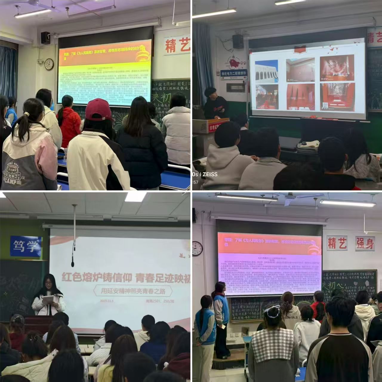 活动中,宣讲团分享了他们在延安期间的所见所闻所感。那些源自亲身经历的鲜活故事,将延安精神具象化为可感可知的身边事例,深深打动了在场的每一位同学,激发了大家的情感共鸣和思想认同。各班分别围绕“青年学子如何传承延安精神”及“如何将延安精神融入日常学习生活”等议题展开了热烈的互动讨论。同学们踊跃发言,结合分享者的感悟和自己的实际情况,畅谈心得体会。随后,在各班团支书带领下,集体诵读《为人民服务》,朗朗书声回荡在教室,字字句句重温了党的根本宗旨和共产党人的崇高追求。