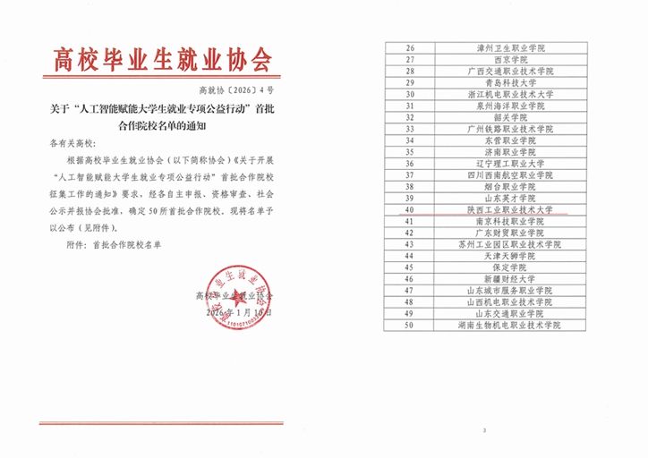 近日,高校毕业生就业协会正式公示“人工智能赋能大学生就业专项公益行动”首批合作院校名单,我校凭借在就业育人工作中的扎实基础与创新实践成功入选,成为全国50所首批合作院校之一。