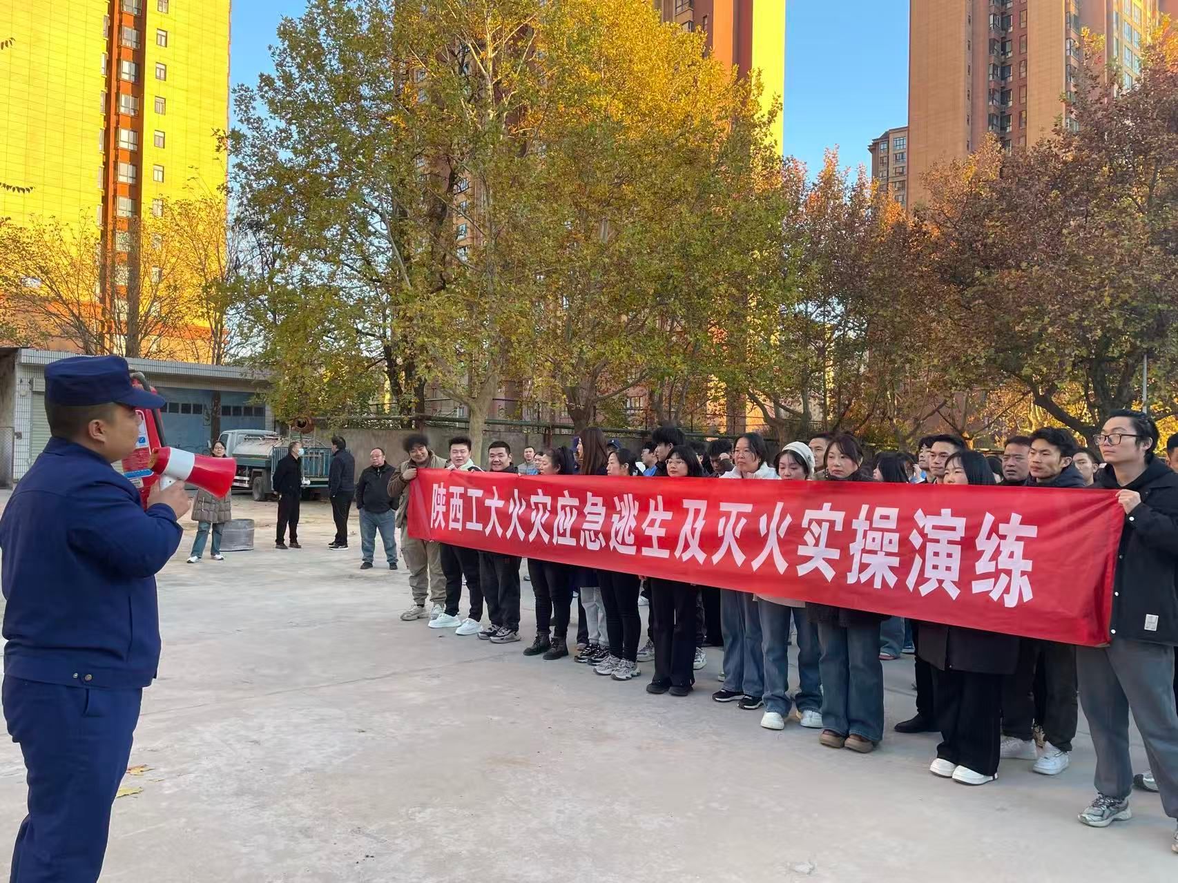 为落实省委厅关于2025年度消防安全月有关要求,切实增强广大师生的消防安全意识,提升应对突发火灾事件的应急处置能力和自救互救技能,11月18日,我校成功组织了火灾应急疏散及灭火实操演练。本次演练由学校保卫处牵头,联合学生工作部、土木学院、材料学院、化纺学院、国有资产处等多部门共同组织实施,500余名师生和第三方商户参与其中,渭城区文汇路消防所全程指导演练。